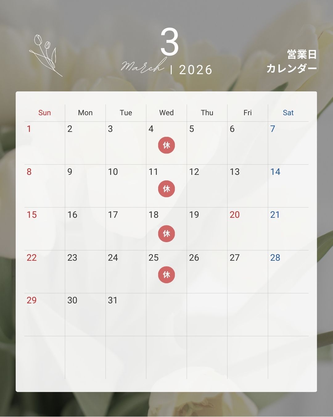 3月は毎週水曜日が定休日になります。